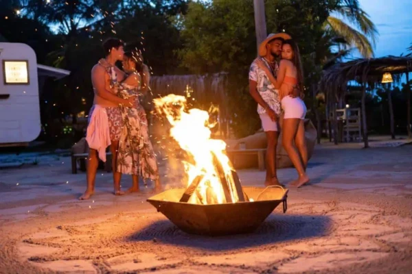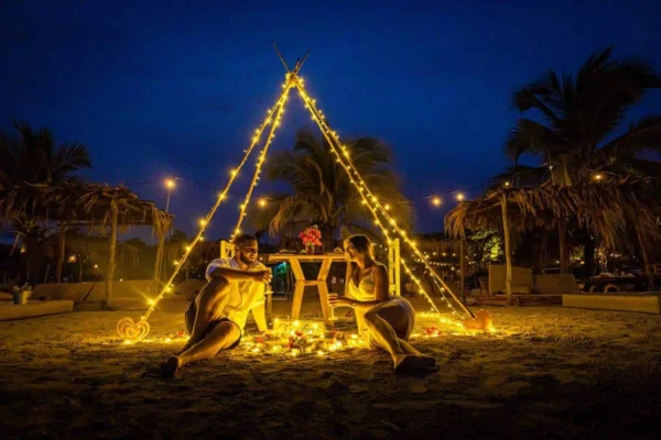 El escenario se ilumina con la suave luz de las antorchas y la luna reflejada en las aguas cristalinas del Caribe, creando un ambiente íntimo y mágico. Sumérgete en la comodidad de nuestras mesas en la arena, adornadas con elegancia y sutileza, mientras el sonido suave de las olas y la música ambiental crean la sinfonía perfecta para tu velada